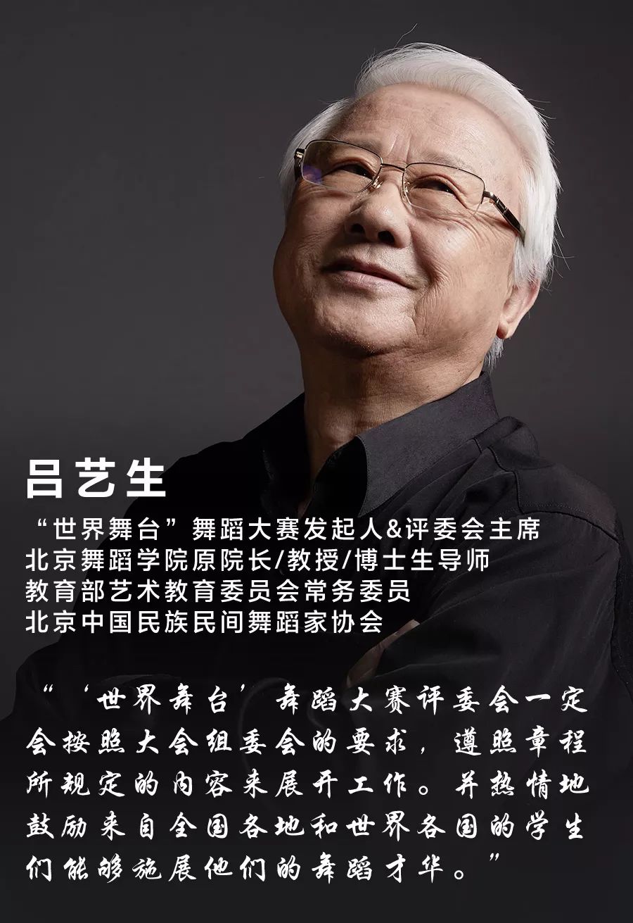 为确保赛事的专业高度及评判公允,“世界舞台”舞蹈大赛成立了组委会、评委会及艺委会。委员会均由社会各界知名人士组成,且大赛有幸邀请到潘志涛老师、吕艺生老师以及张继钢老师坐镇主席团。