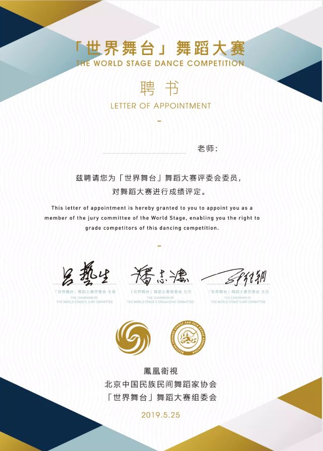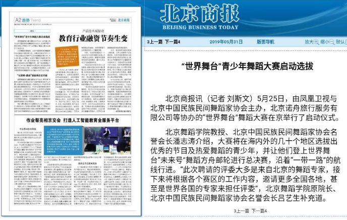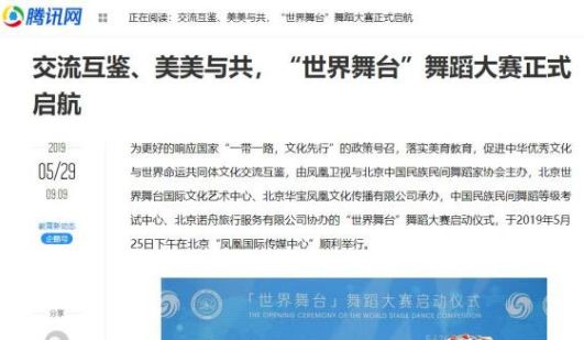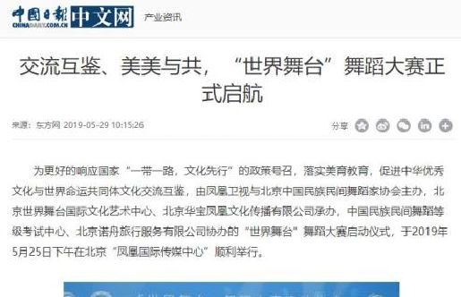 2019年5月25日下午16:00,由凤凰卫视、北京中国民族民间舞蹈家协会主办,北京世界舞台国际文化艺术中心、北京华宝凤凰文化传播有限公司承办,中央民族大学舞蹈学院、CFA中国民族民间舞蹈等级考试中心、北京诺舟旅行服务有限公司合作举办的“世界舞台”舞蹈大赛启动仪式,在北京凤凰国际传媒中心顺利召开。