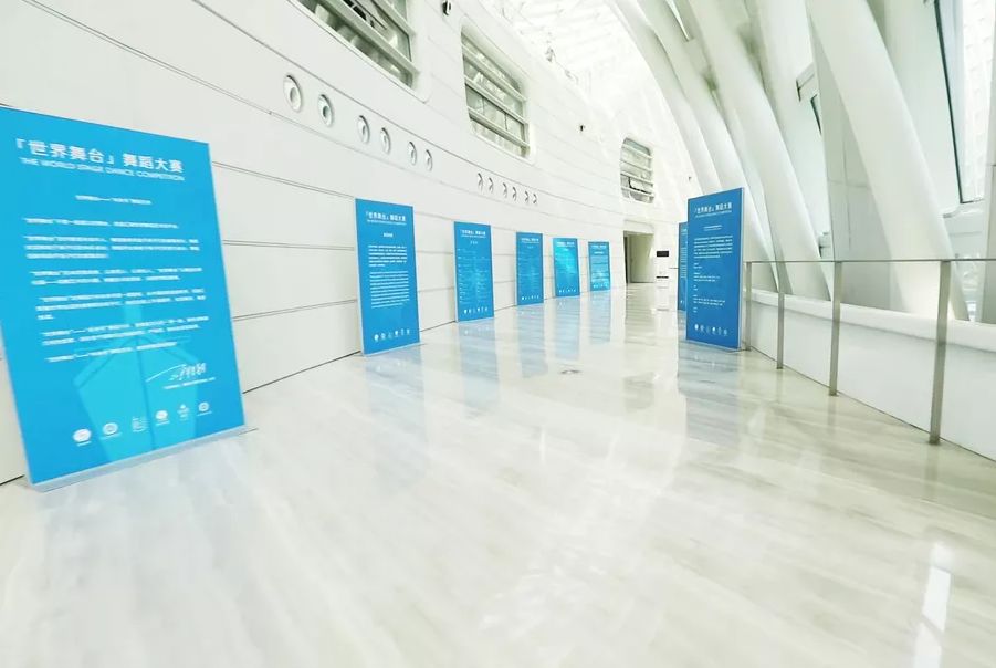 图四:两侧摆放的“世界舞台”舞蹈大赛宣传展板