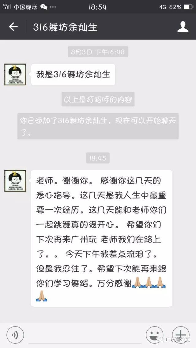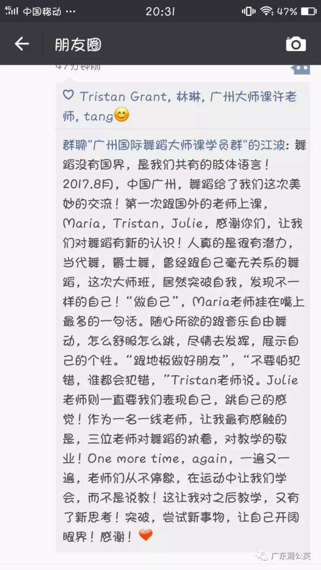 “我从小就非常喜欢跳舞,但是因为种种原因,我从来没有专业学过舞蹈,现在我快十五岁了,有点微胖。我的身材和我身体里跳动的某种舞蹈细胞一直让我问自己“我适合跳舞吗?”这次偶然的机会我参加了今年暑假在广州举办的“广州2017年8月3日—7日国际青少年舞蹈大师课”怀着试一试玩一玩的心情我走进了课堂,通过几天的学习生活,我们一起挥洒汗水一起欢笑。老师们的精心的组织、美国大师们专业、亲切、幽默又热情的启发式授课,让我深深感受到舞蹈的魅力,我身上深深潜伏的那些舞蹈精灵好像都被唤醒、完全爆发!现在我可以很肯定地告诉自己:“我可以跳舞、我要跳舞、我非常非常爱跳舞!” 谢谢你Julie 老师、谢谢你Tristan 老师、谢谢你Marie 老师、谢谢你我的十四岁、谢谢你、2017、夏季、广州。 ”