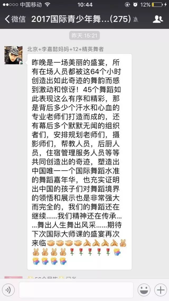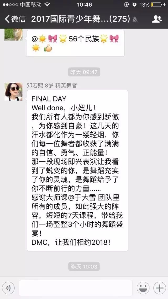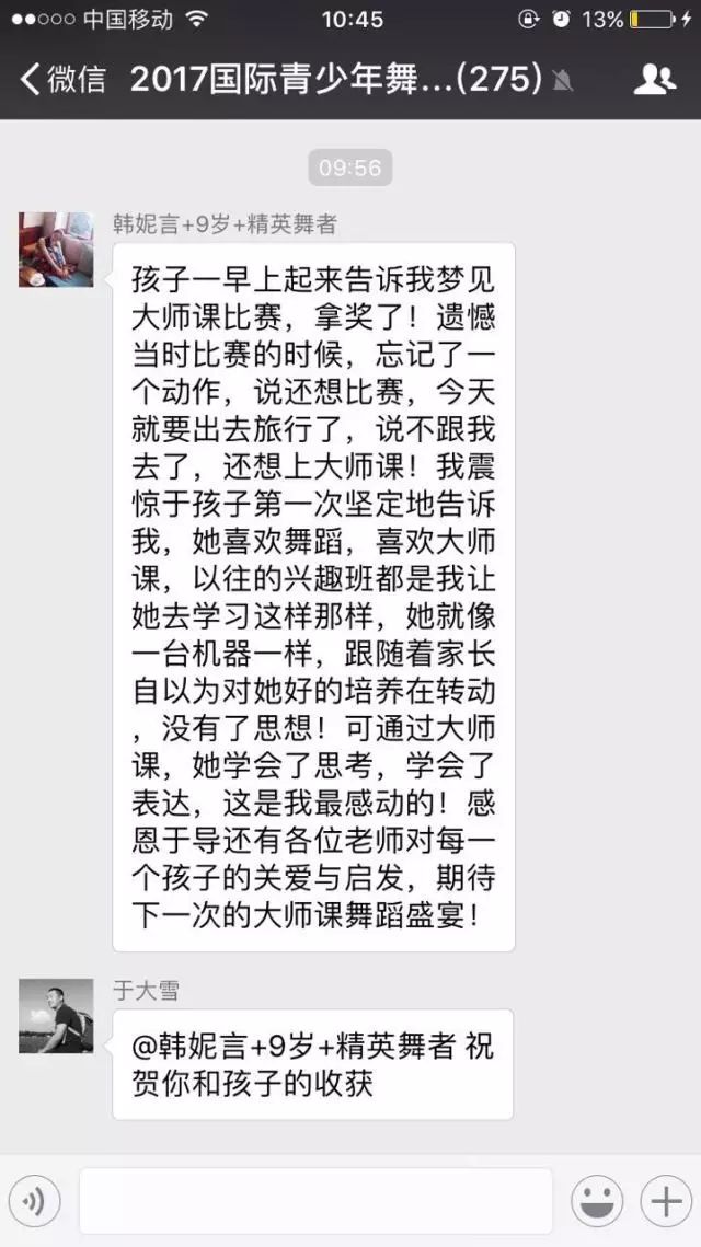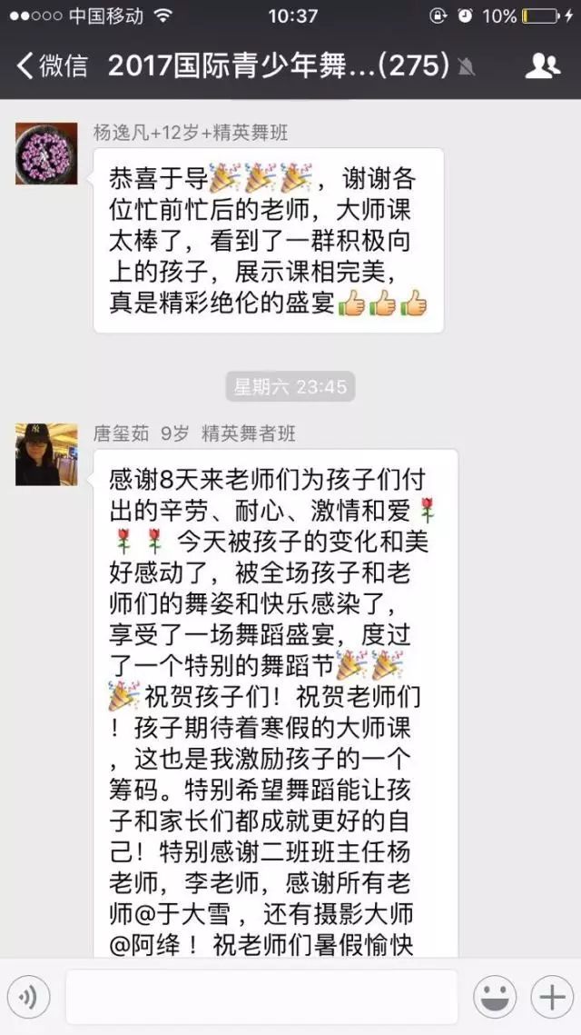 体,音乐舞蹈滋养的是我们的灵魂。而如今,舞蹈已经是全世界大家都在从事并热爱的活动。舞蹈给了我内心最深处的喜悦以及勇气。从大师课我看到了的孩子和我们的舞者跳起来非常得有力量、开心、勇敢,非常感谢有这样的机会来和所有的工作人员以及热爱舞蹈的人共度这一周时光,希望舞蹈成为孩子们一生中最快乐、最幸福的事情,也希望通过舞蹈能走遍全世界,结交各种好友,也在此向各位家长发出邀请,我们都跳起来动起来吧!即时是在家里、卧室里、客厅里,跟孩子们一起跳舞也是件特别棒的事,也许大师课明年将会为家长们开设这样的课程哦!