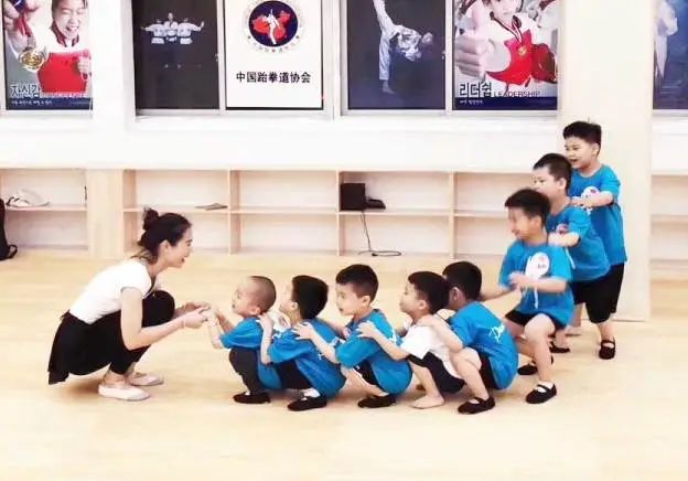 ▲助教老师带领男孩子们进行课前热身