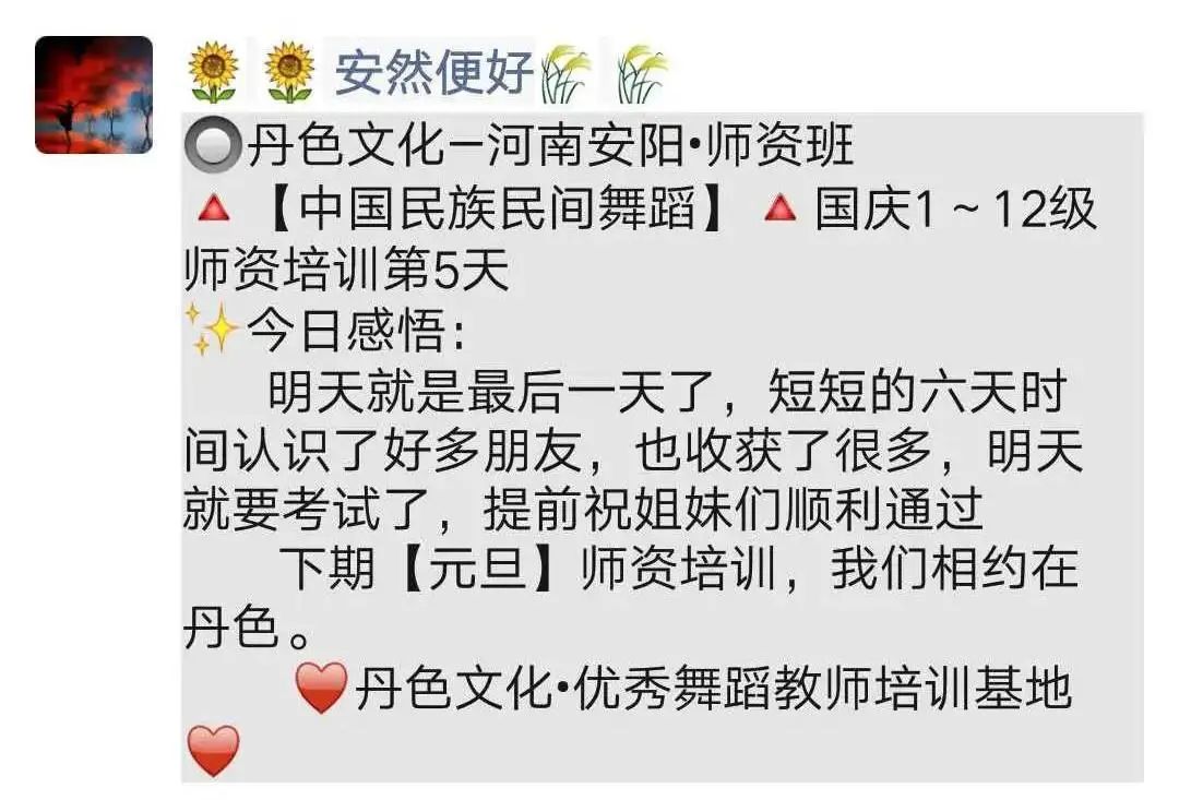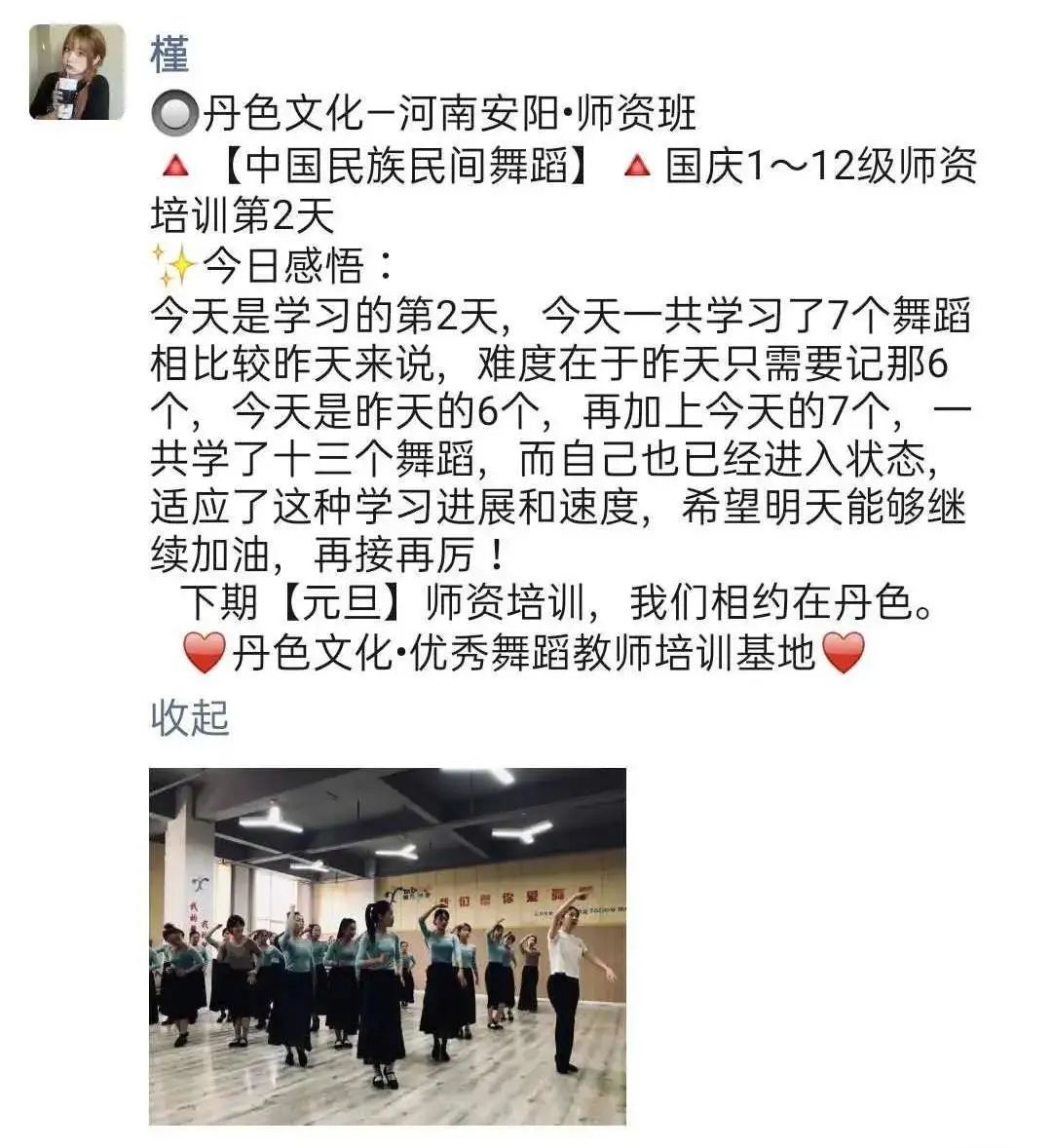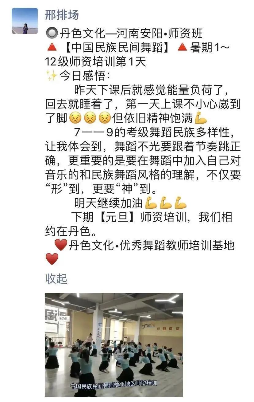 “因为热爱中国民族民间舞蹈,使得同样在舞蹈教育艺术之路上的我们有缘在鹤壁相遇。学员们不断交流、学习、了解并掌握了舞蹈教学的方法、要点及目的,并透过舞目本身了解更深层的民族民间文化内涵。