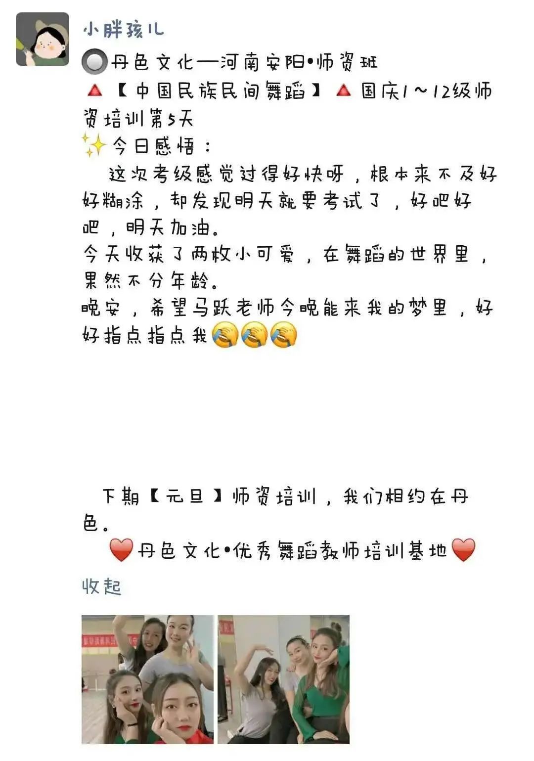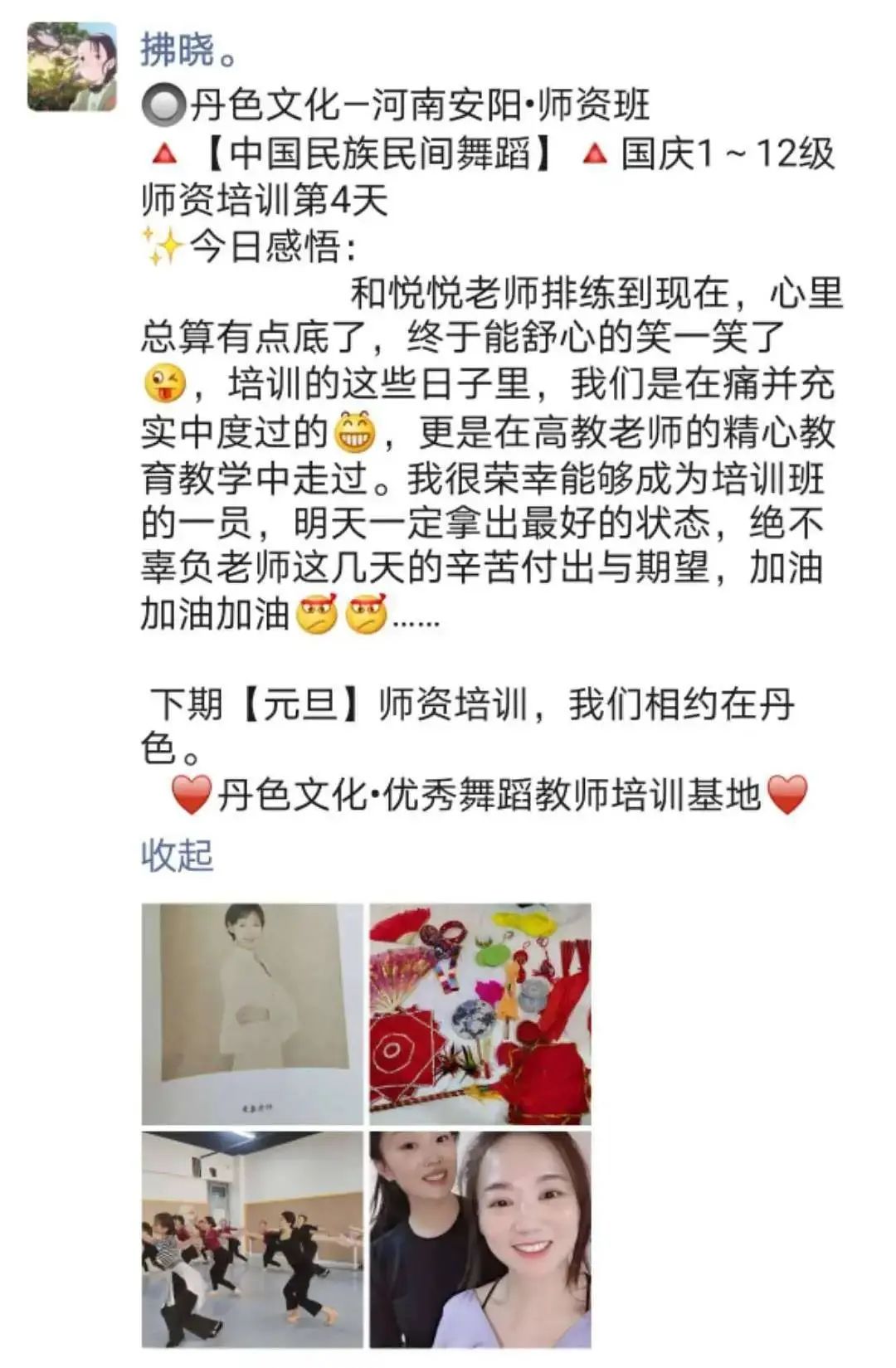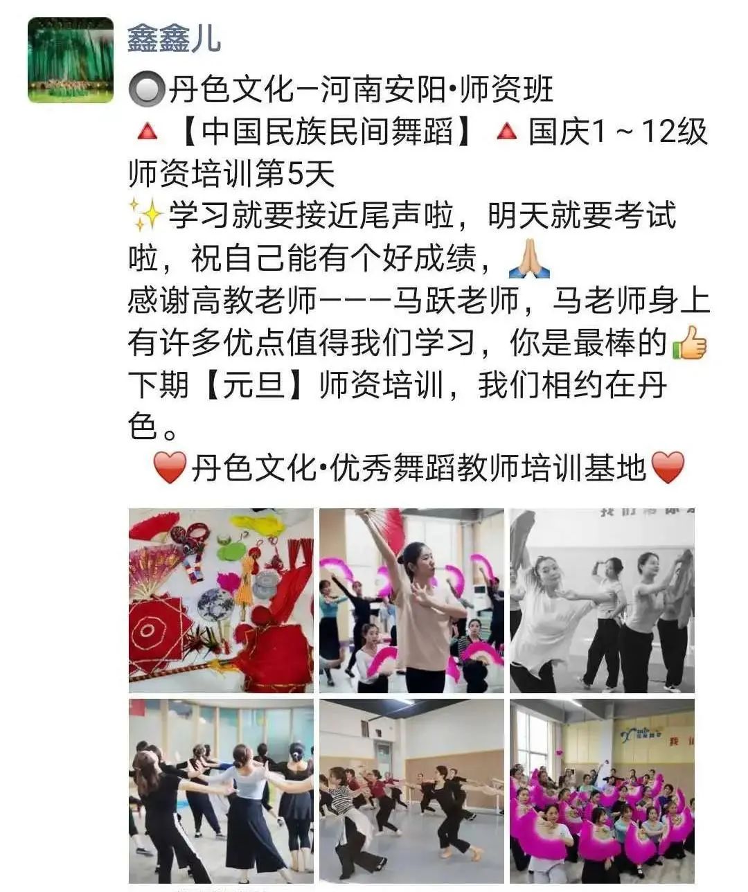 “因为热爱中国民族民间舞蹈,使得同样在舞蹈教育艺术之路上的我们有缘在鹤壁相遇。学员们不断交流、学习、了解并掌握了舞蹈教学的方法、要点及目的,并透过舞目本身了解更深层的民族民间文化内涵。