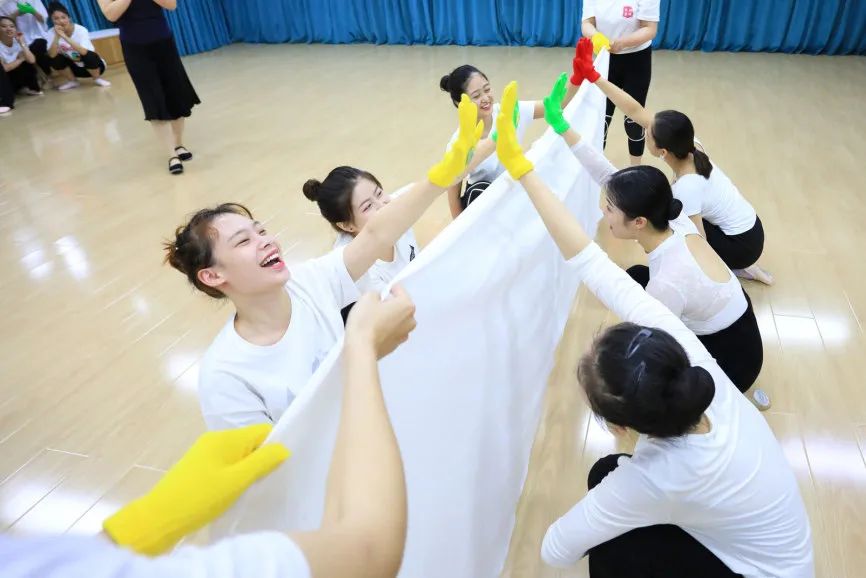 课堂上,学员们利用布帘,体验着幼儿与家长合作完成不同方向的击掌、碰拳、勾指等动作,在上下左右的配合中玩耍,她们是那样快乐!