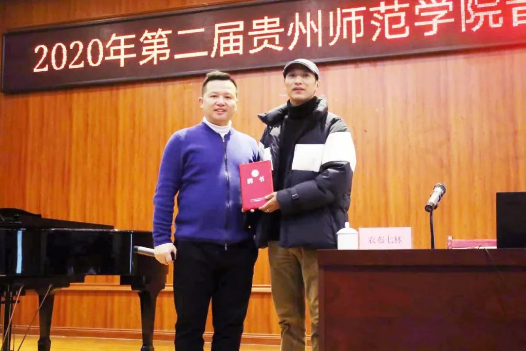 ▲肖伟主任为农布七林老师颁发贵州师范学院音乐舞蹈学院客座教授聘书
