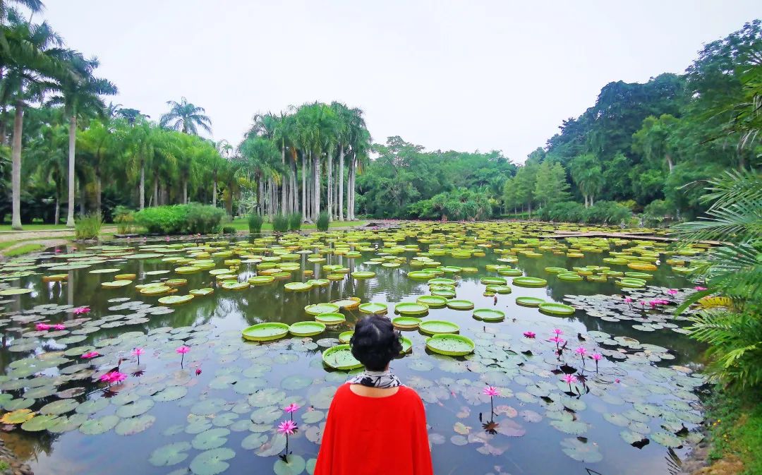 “一叶王莲做轻舟”西双版纳植物园中的王莲具有世界上水生植物中最大的叶片,直径可达3米以上。叶面光滑,叶缘上卷,犹如一只只浮在水面上的翠绿色大玉盘,圈出一方静谧和舒爽。