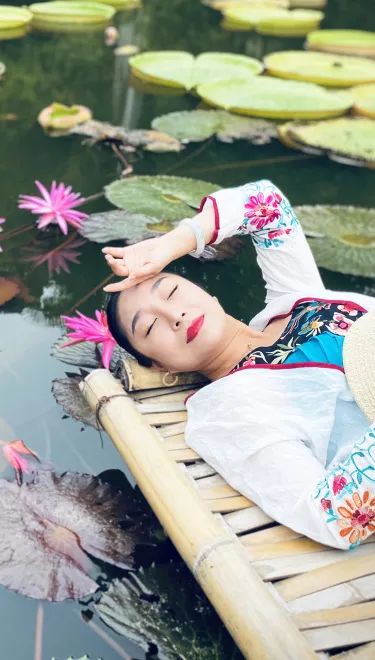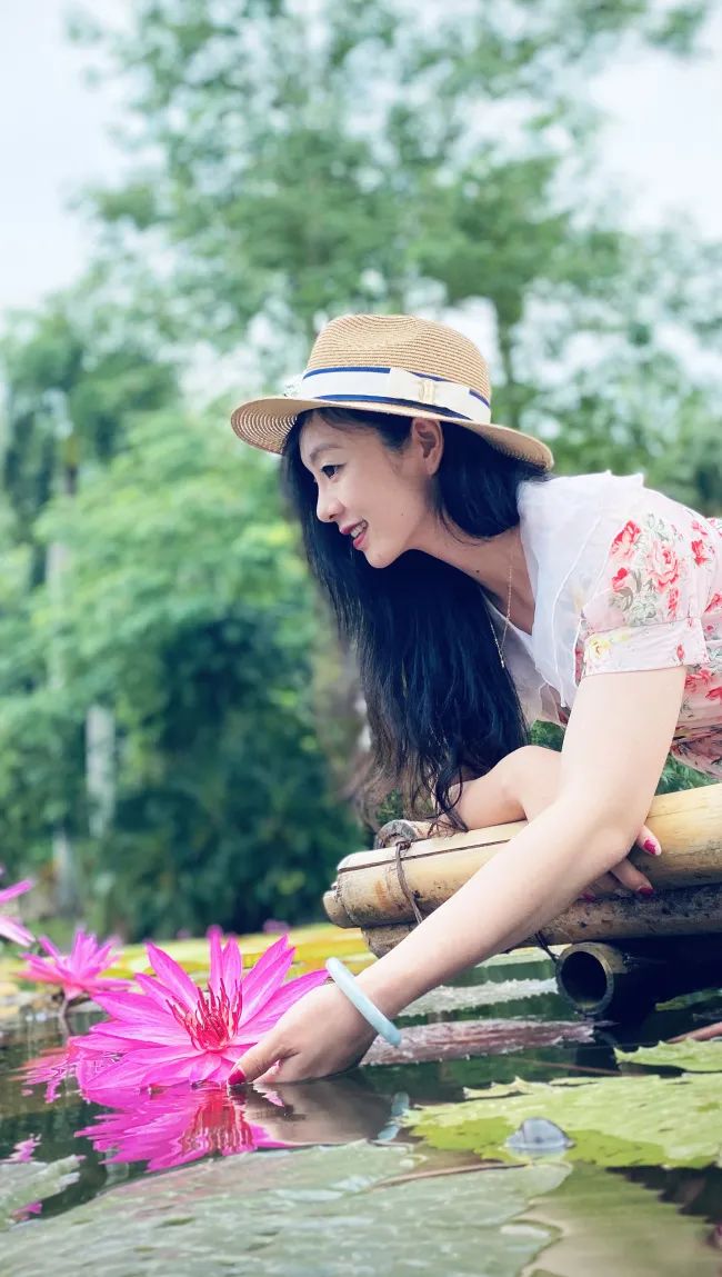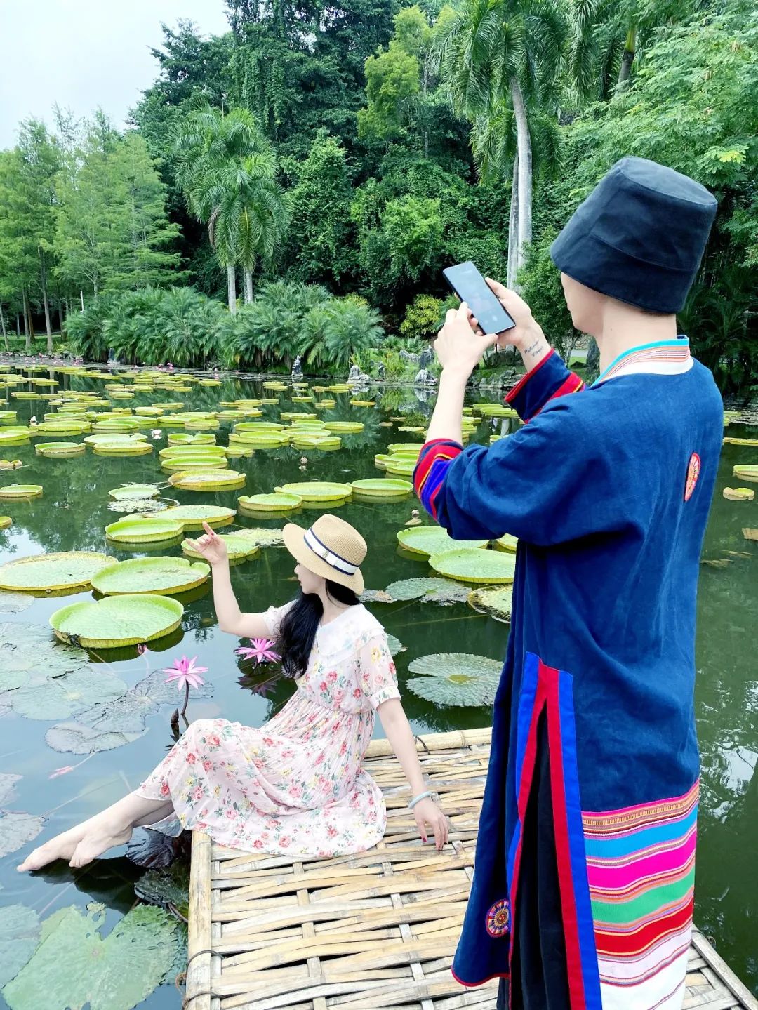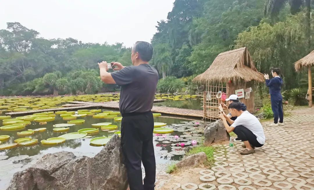 采风团老师们踩在王莲池悬浮的竹排上,与美丽的王莲美景相融,犹如一幅别致的风景画……