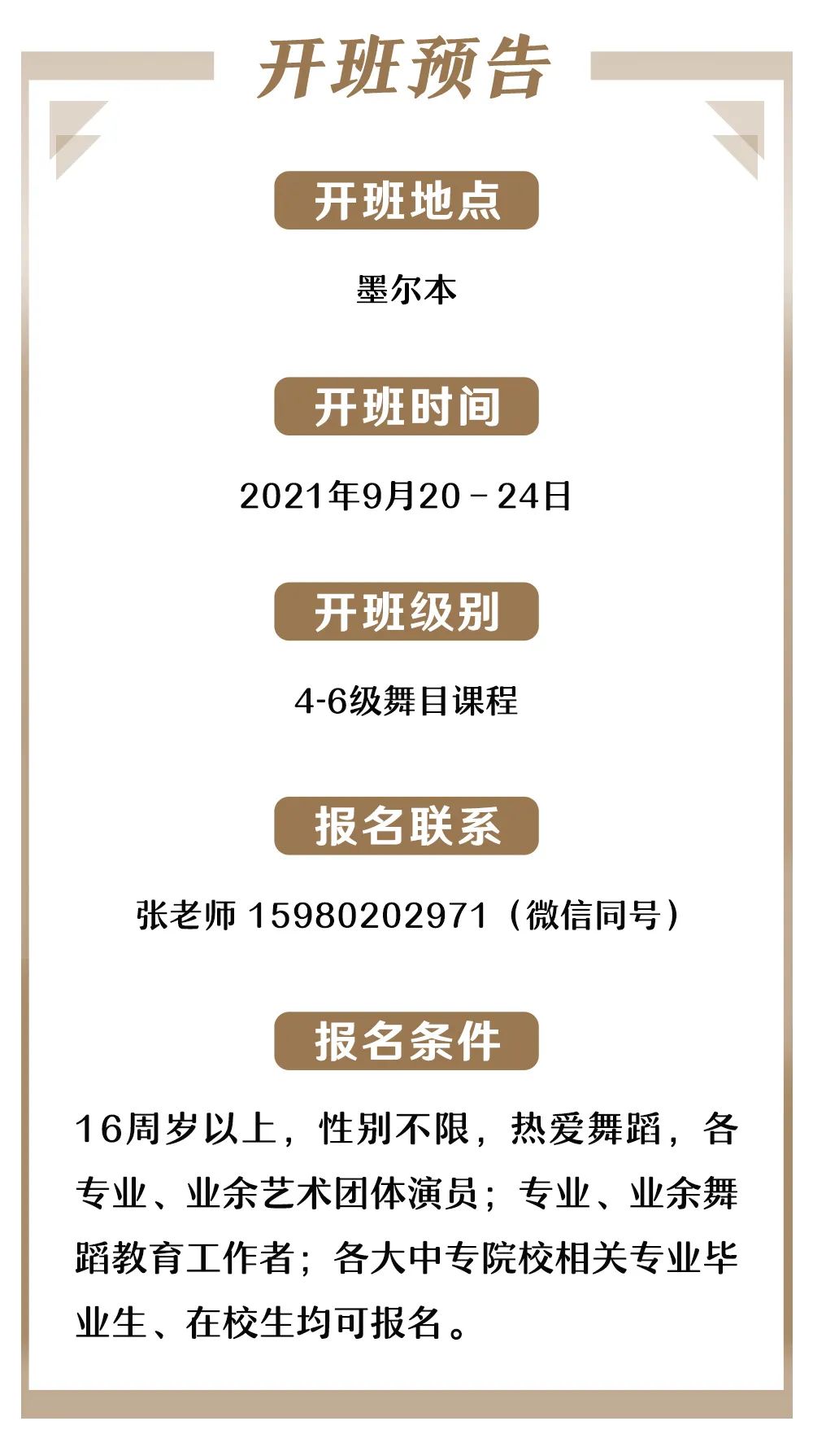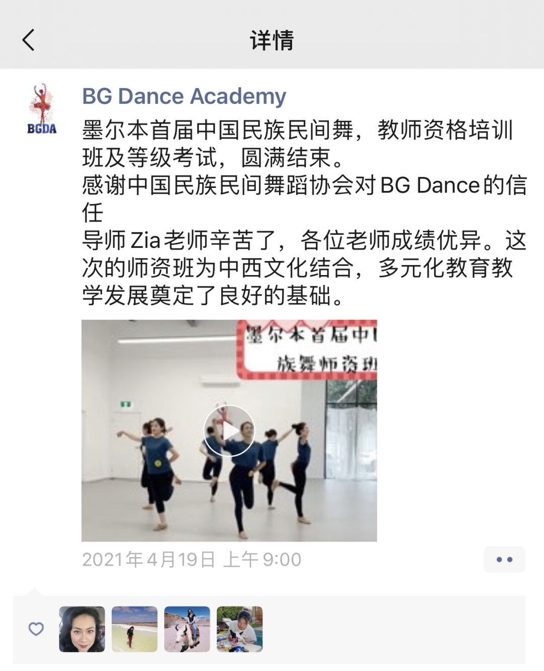 继2021年2月澳大利亚悉尼地区师资培训班圆满落幕后,2021年4月15日-18日,由“BG Dance Academy”组织开展的首期《中国民族民间舞蹈等级考试女生版教材》1-3级师资培训班,于澳大利亚墨尔本地区如期开班。此次开班,为在澳大利亚从事舞蹈教学及热爱民族民间舞的学员们,提供了便捷且优质的学习机会,不必再为了参培而长途跋涉回到中国。