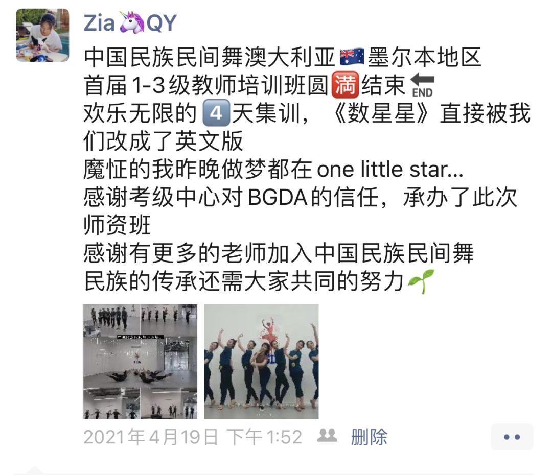 “非常开心能够参加此次1-3级师资培训班,通过此次培训,我学到了先进的教学理念与专业的舞蹈知识。希望通过我们的推广能让中国民族民间舞蹈等级考试在澳洲生根发芽,让更多的孩子能够通过学习中国民族民间舞蹈了解到中华民族文化的博大精深。”