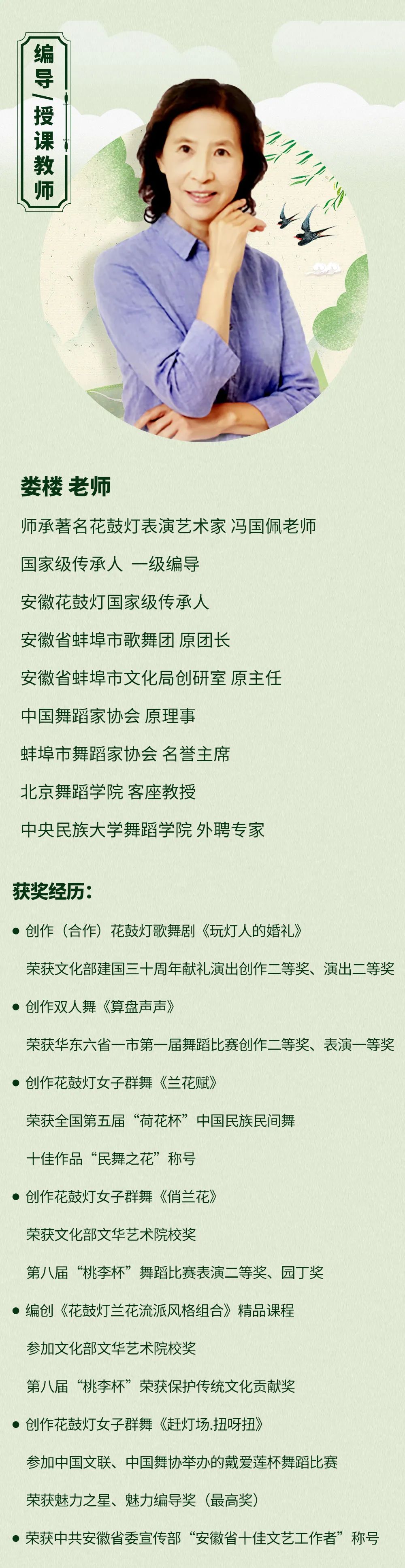 飞花绰绰,起舞赶春。2021年6月23日-24日,安徽花鼓灯国家级传承人 娄楼老师为大家带来了由她与南京艺术学院 舞蹈学院 教育系主任赵佳老师共同编创的《表演级教材》14级安徽花鼓灯《赶春》的精彩教学。