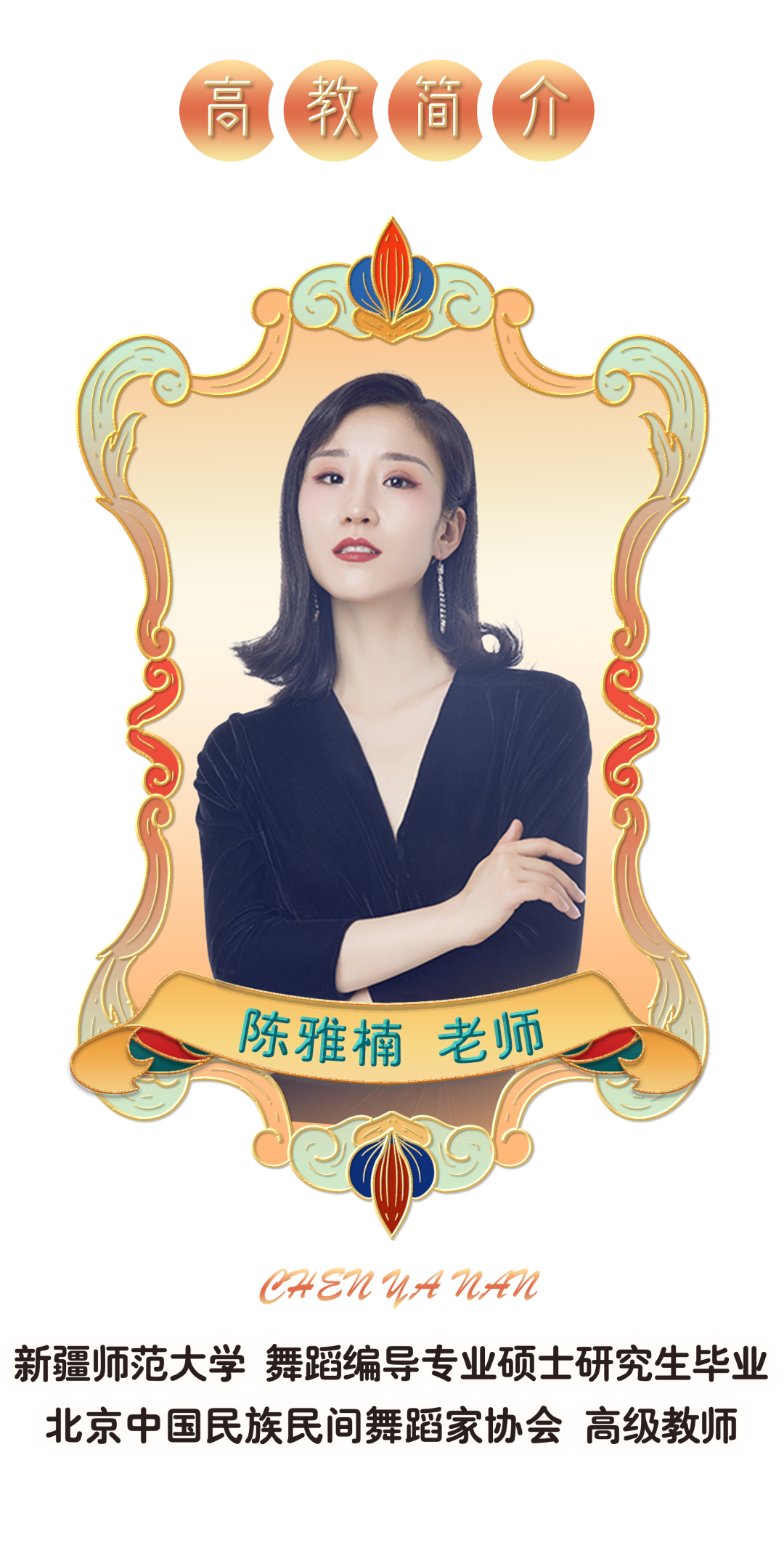 作为一名幼儿教师,我希望通过教授舞蹈,带领小朋友们去探索各民族不同的生活方式、风俗习惯,让他们喜爱舞蹈的同时,领悟民族精神,感受中华文化。