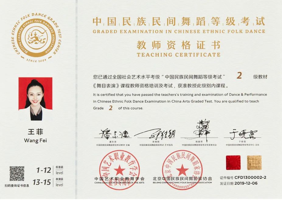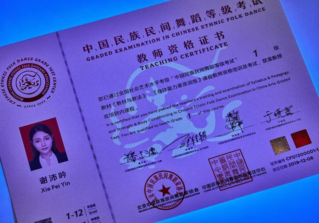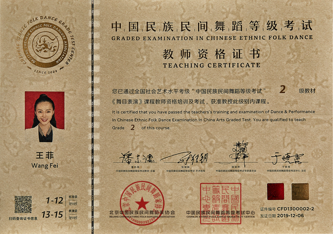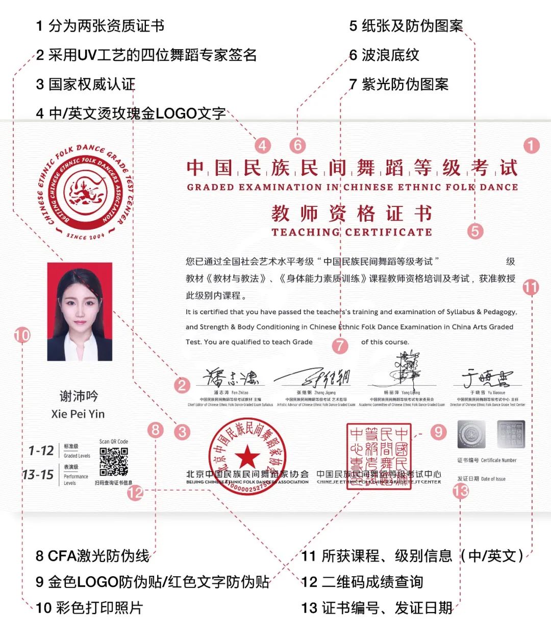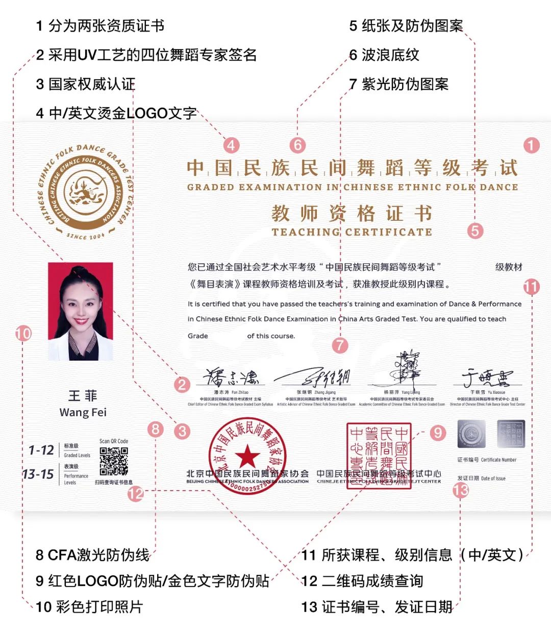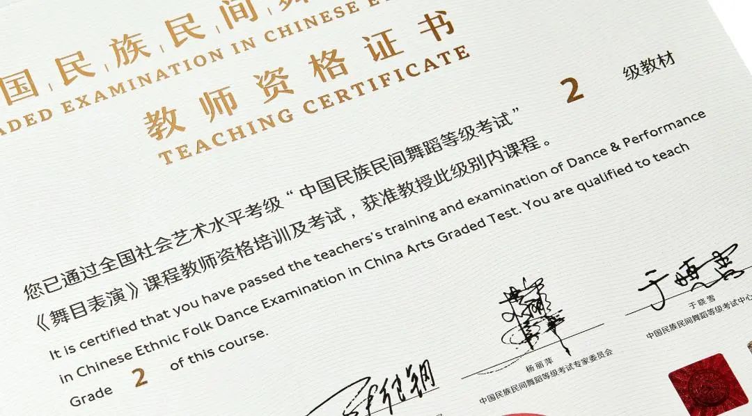 中国民族民间舞蹈等级考试历经十六年的发展,进入了新的历史高度和发展空间。于2020年1月,经过反复多次的创意碰撞,将实际需求与世界一流设计理念相融合,采用多种防伪及印刷工艺,并汇集四位顶级舞蹈专家签名认证的教师资质证书,一经推出,便受到大家的广泛关注与青睐,更收到了众多持旧版证书的老师们希望更换全新版证书的需求。