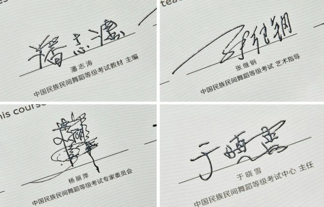 ▲舞蹈教育、编创、表演领域的四位顶级专家——潘志涛老师、张继钢老师、杨丽萍老师、于晓雪老师的手写签名认证,让证书更具权威性
