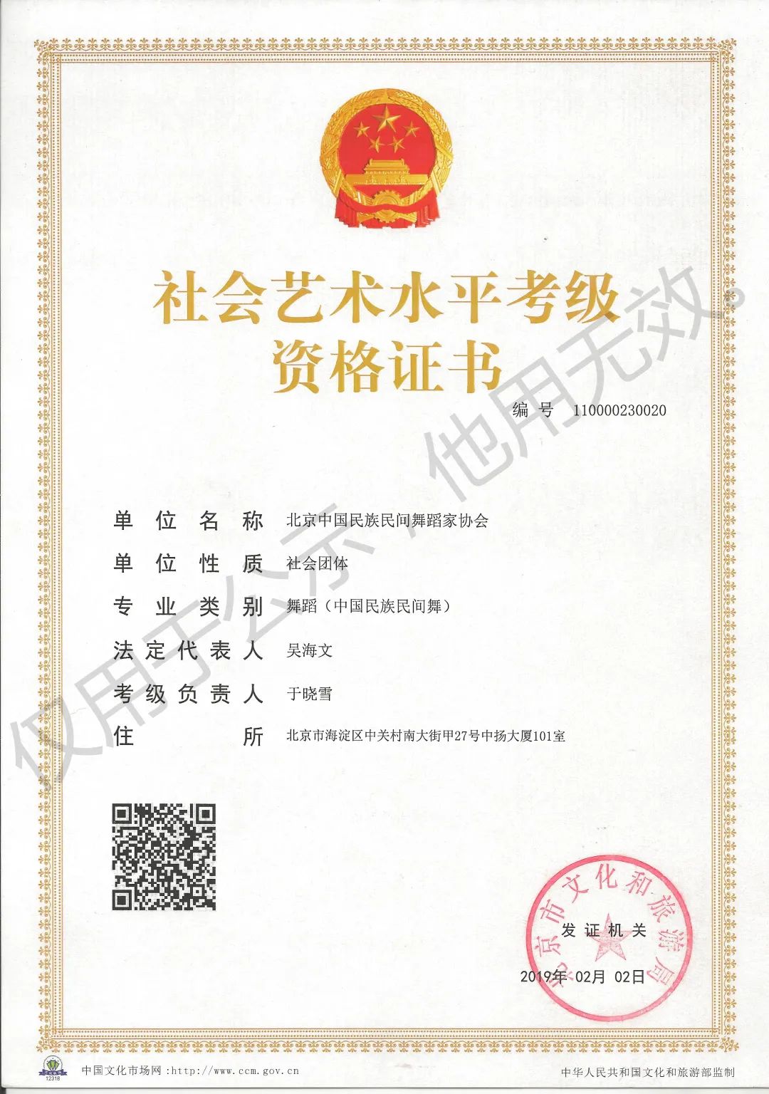 同年,经文化和旅游部审核、北京市文化和旅游局批准,同意“北京中国民族民间舞蹈家协会”开展中国民族民间舞考级,专业代码020102。自此“中国民族民间舞蹈等级考试中心”将全部事务由“中国艺术职业教育学会”正式转至“北京中国民族民间舞蹈家协会”。