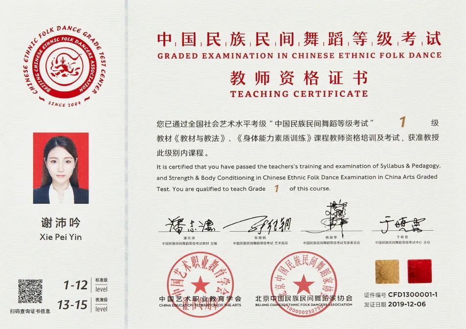 1-12级教材全新版教师资格证书,共分为“《舞目表演》课程”与“《教材与教法》《身体能力素质训练》课程”两张资质认证,从而体现出师资培训的全面性与专业性。