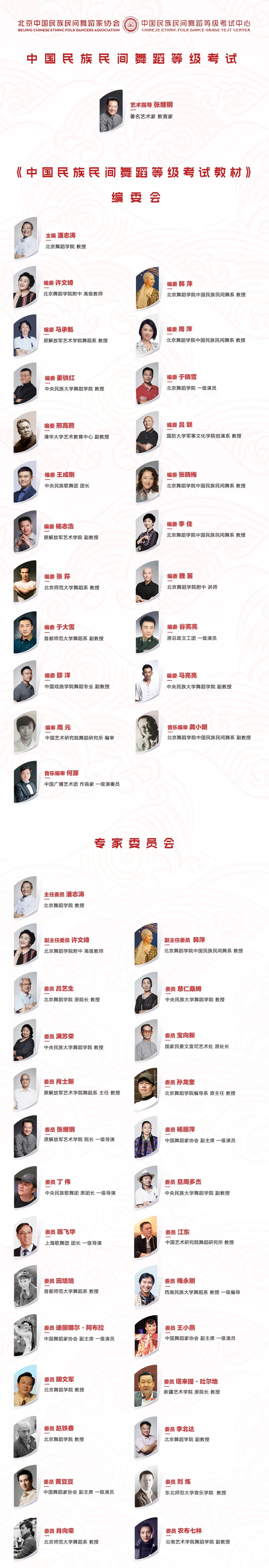 深受师生及家长们喜爱与认可的《中国民族民间舞蹈等级考试教材》原由人民艺术家贾作光老师,现由著名艺术家张继钢老师担任艺术指导、著名教育家潘志涛老师等国内权威专家领衔,汇集了来自全国各大艺术院校、院团及各地区非物质文化遗产传承人等数百位舞蹈专家,组成强大的编委与专家团队。