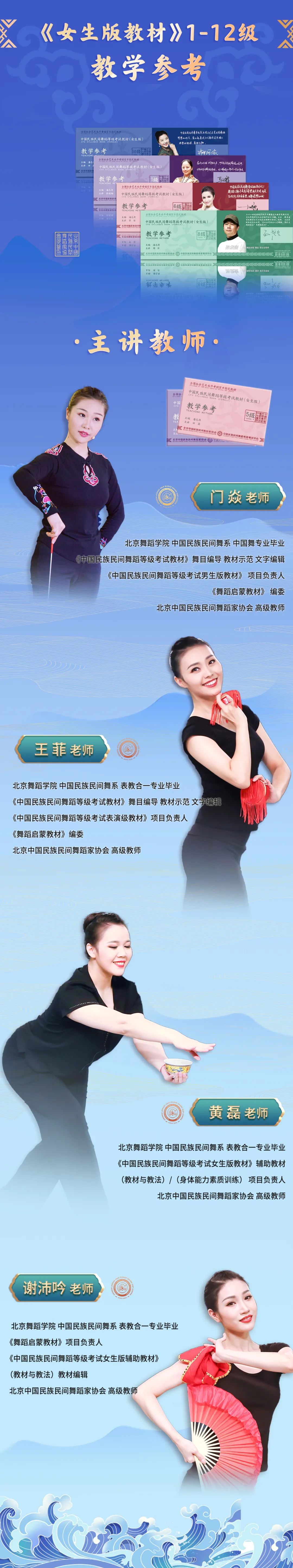 2021年4月起《中国民族民间舞蹈等级考试教材》女生版1-12级全面升级,由DVD光盘调整为U盘、电子版为载体,并新增《教学参考》部分。每个级别教材共包含:《教材示范与讲解》、《教学参考》、《伴奏音乐》三个部分。