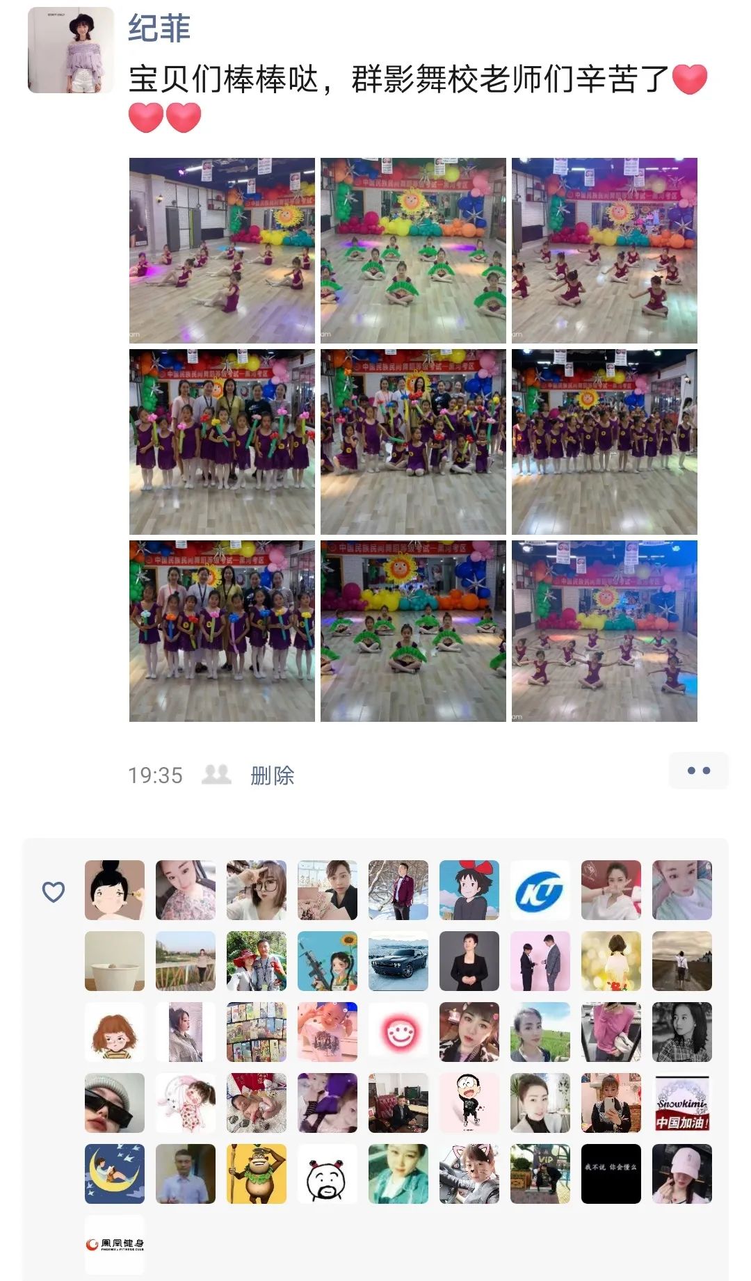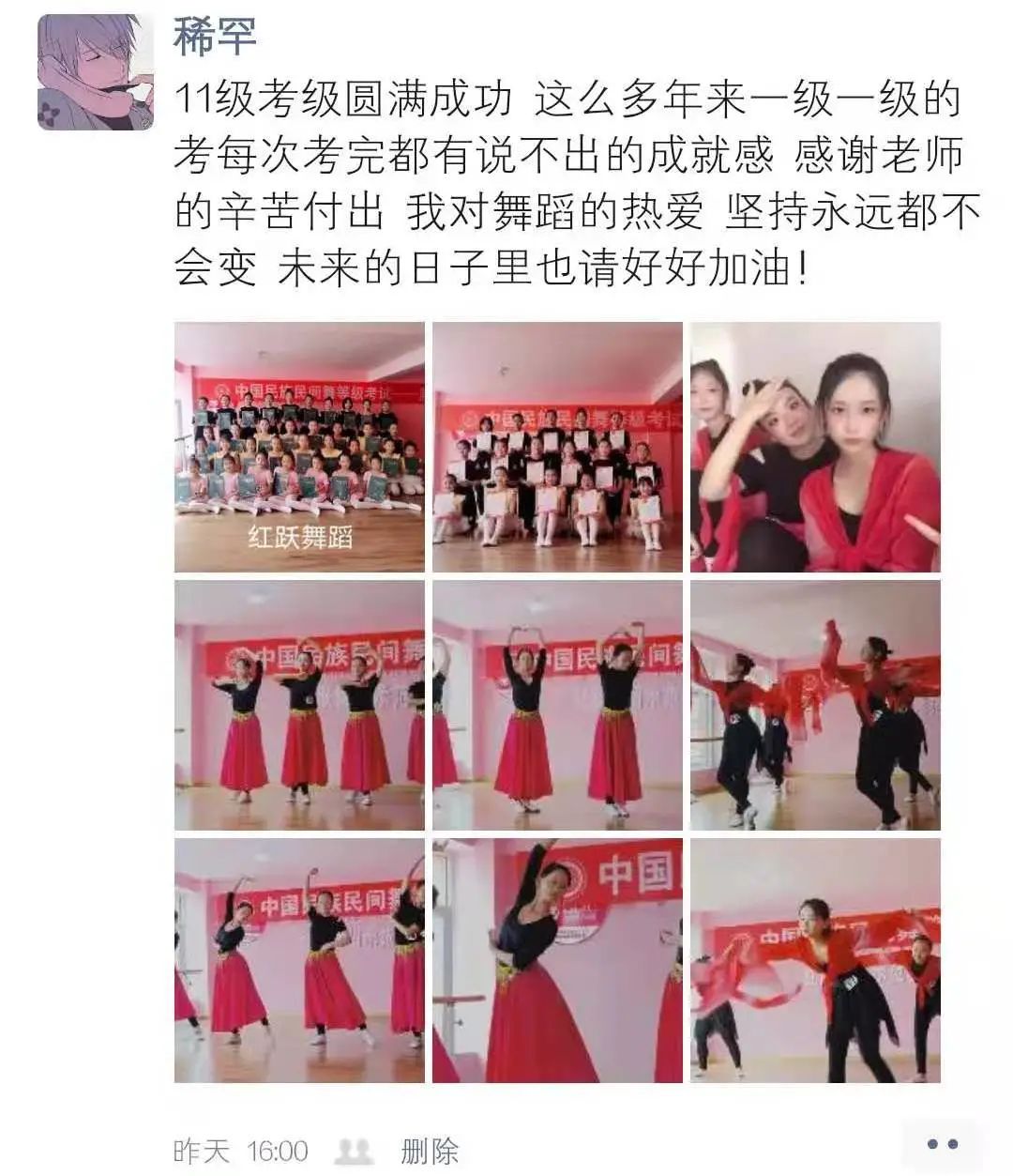 孩子刚参加了中国民族民间舞蹈等级12级的考试,首先感谢“毳舞舞蹈学校”老师们近八年来对孩子辛勤的付出,用爱心和耐心浇灌着这些小苗,用严谨的学风、认真的态度、负责的精神,把一个个小苗培养成才。这里的教室宽敞明亮,每位老师都很认真的教学,本着“细心指导,以人为本”的人性化教育理念,不断提高着孩子们的舞蹈水平。孩子们在这里快乐的学习舞蹈,作为家长感到特别欣慰。