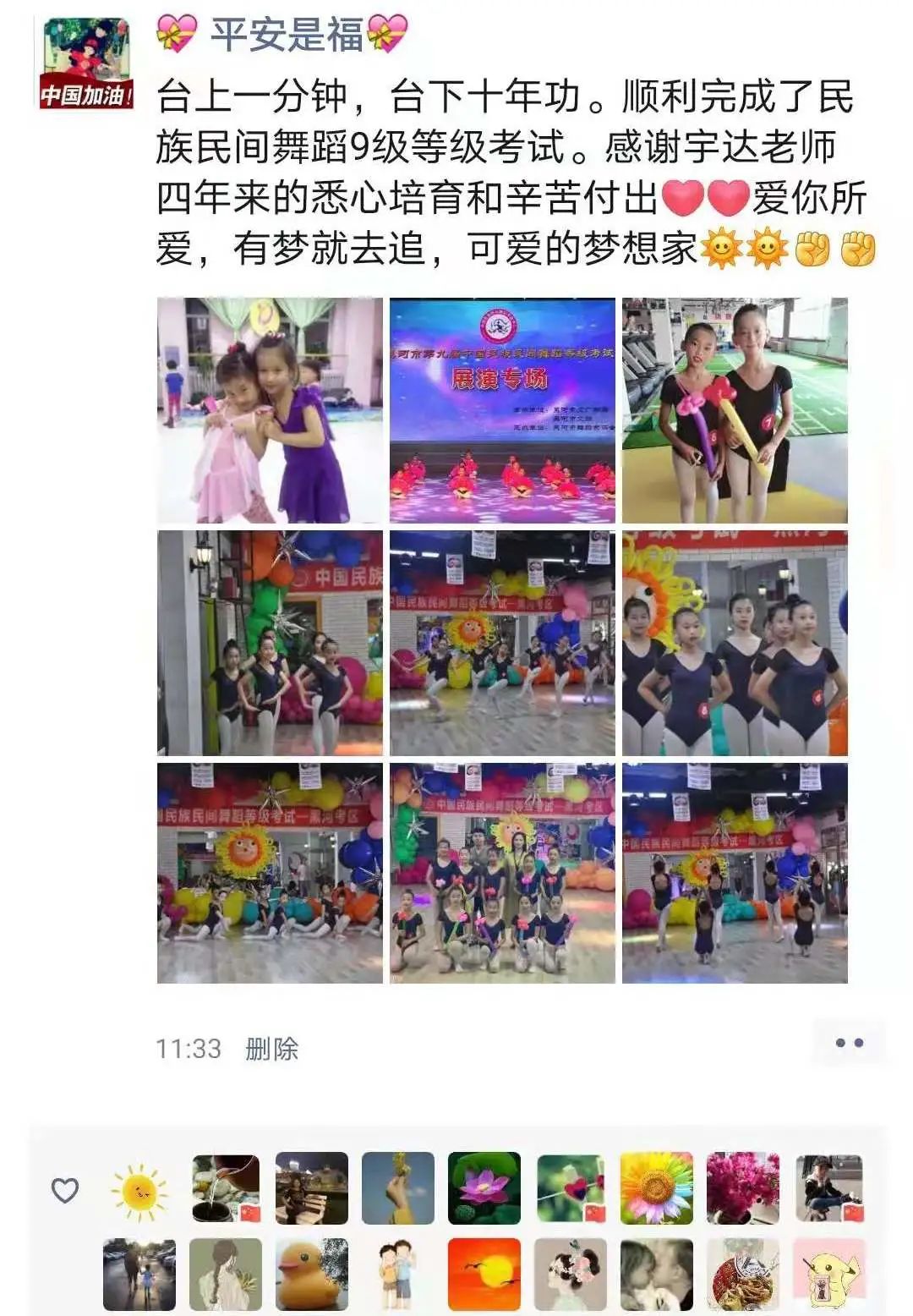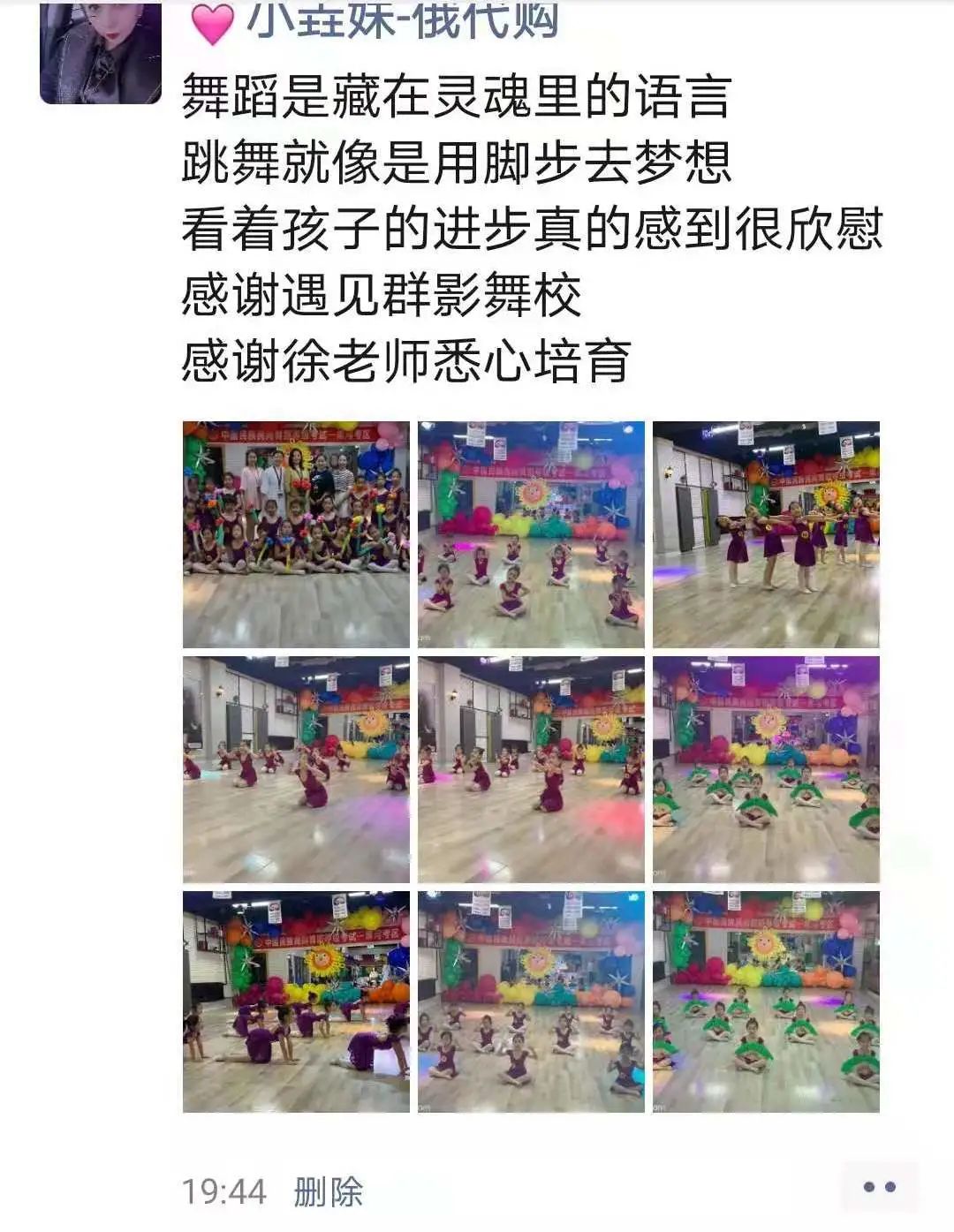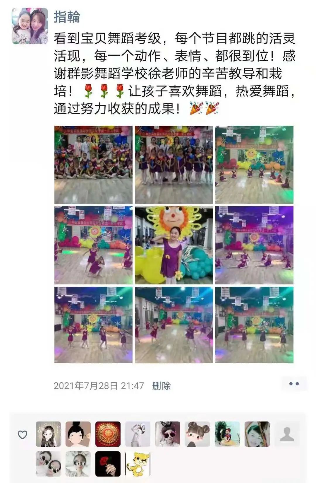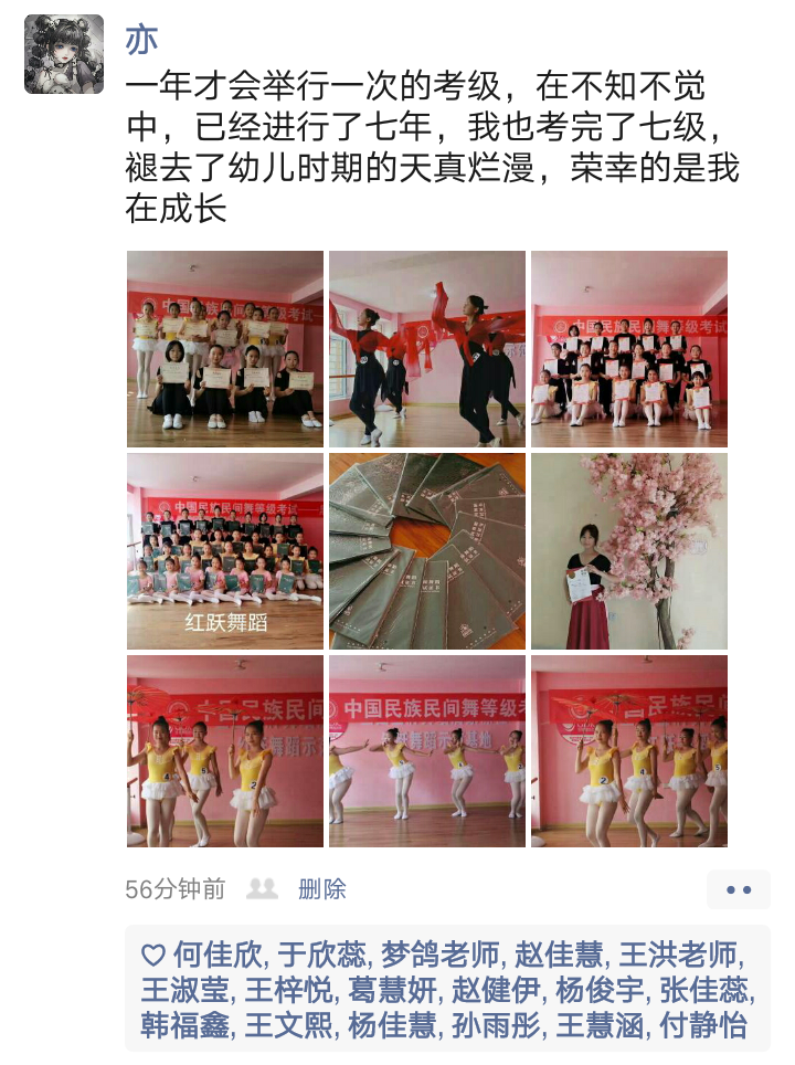 从不会穿舞蹈鞋,到现在可以独立站在舞台上完成演出,我很欣慰。感谢老师的付出与陪伴,一级到现在的十级,切实的看到了孩子的成长,树立了孩子的自信心,同时也体会到了团队的凝聚力。