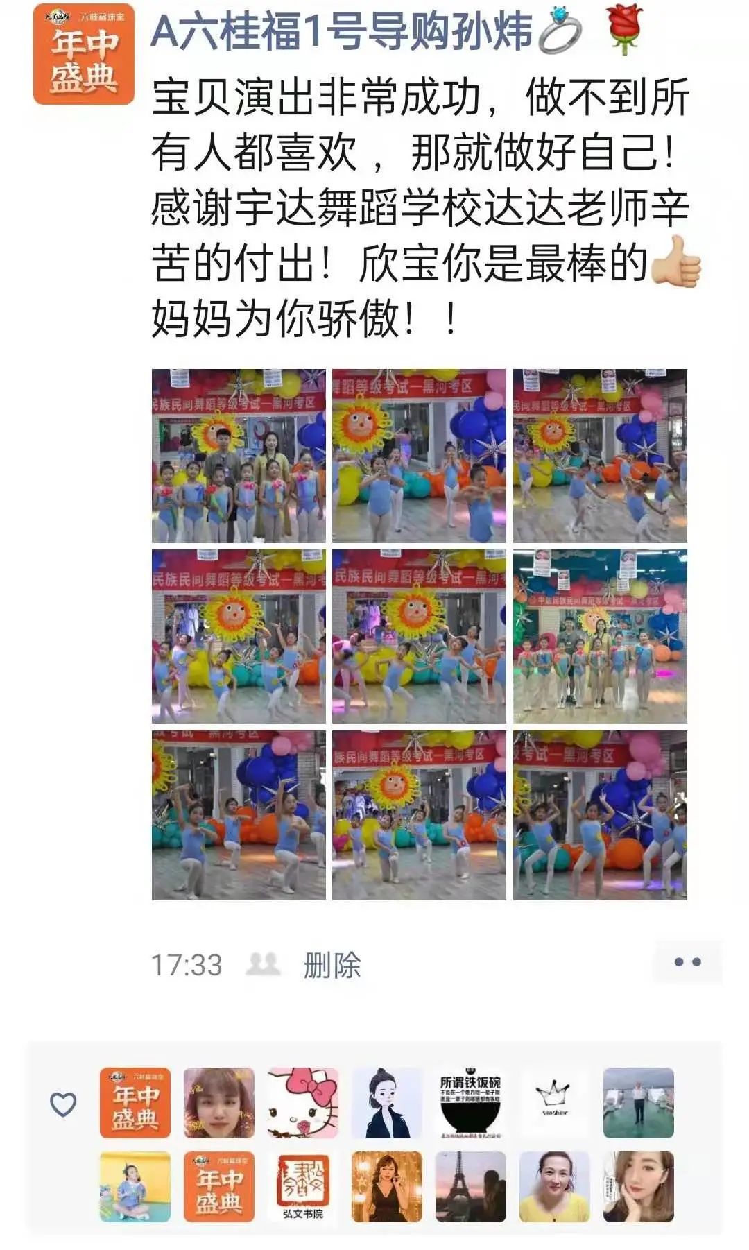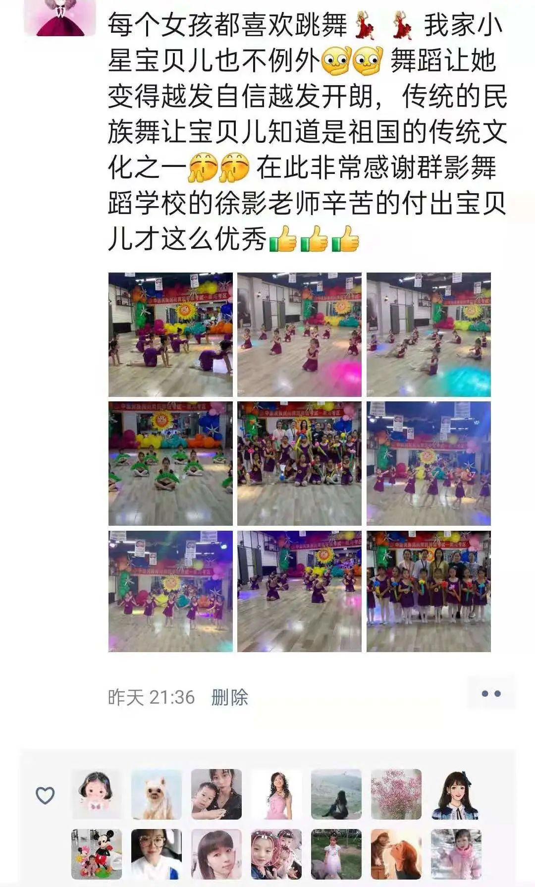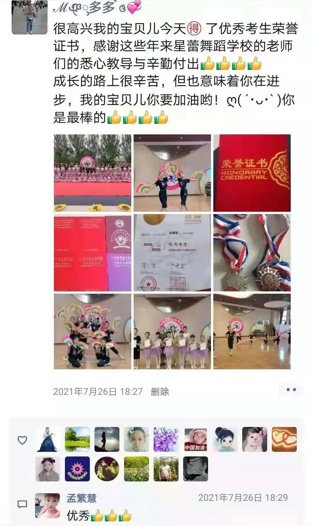 从不会穿舞蹈鞋,到现在可以独立站在舞台上完成演出,我很欣慰。感谢老师的付出与陪伴,一级到现在的十级,切实的看到了孩子的成长,树立了孩子的自信心,同时也体会到了团队的凝聚力。