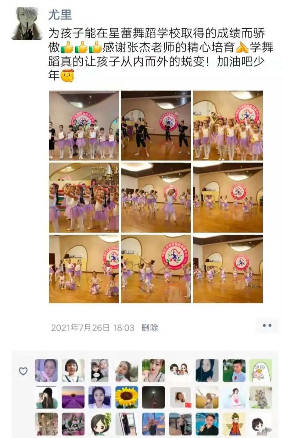 感谢达达老师的耐心教导,孩子能遇到您这么认真负责的好老师是我们的荣幸。孩子在您那里学习,我们非常放心,您不仅教会孩子们跳舞,更教会了孩子们如何做人,您就是孩子们最好的榜样!