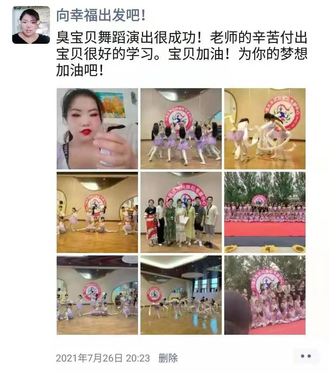 学舞蹈有时确实很苦,但是你的坚持让我知道,你已经是个大姑娘了。我相信这股韧劲会一直伴随着你,并对人生有着不可磨灭的益处。妈妈希望你一直热爱舞蹈,学习再忙也不要把舞蹈落下,毕竟这是你的追求、你的热爱。妈妈希望你能越来越好,加油宝贝!