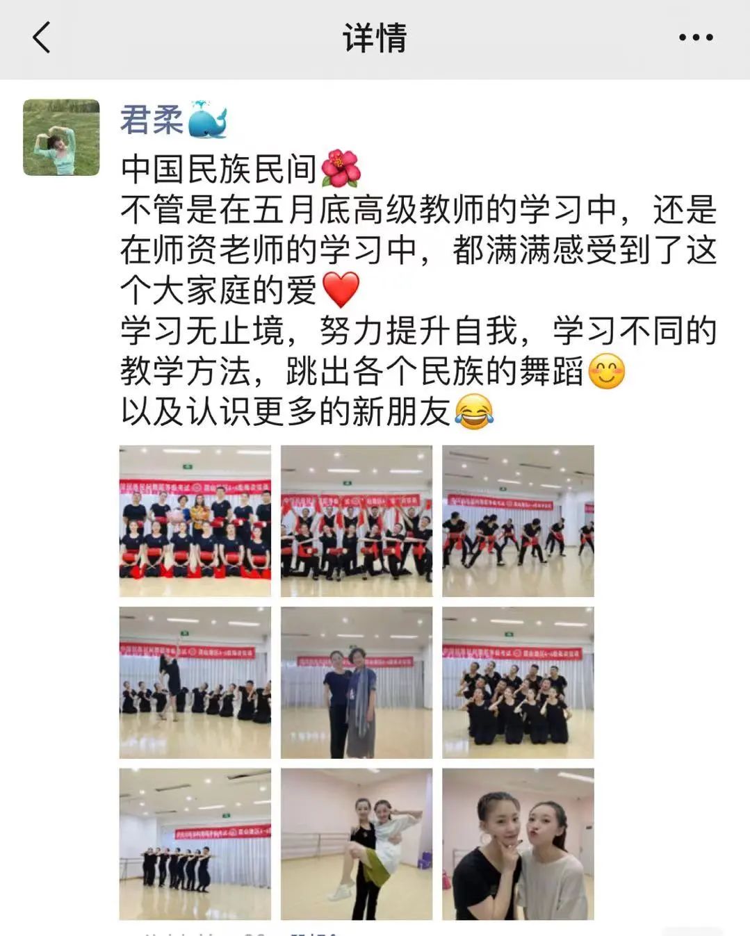 “结束了五天的学习与考试,我在提高舞蹈表现力与自身协调性的同时,还深刻感受到了教材中的专业性与趣味性,了解到多样的民族风格与地域特色。今后我会继续努力学习,在提升自我的同时,传播我们伟大的中华民族文化。”