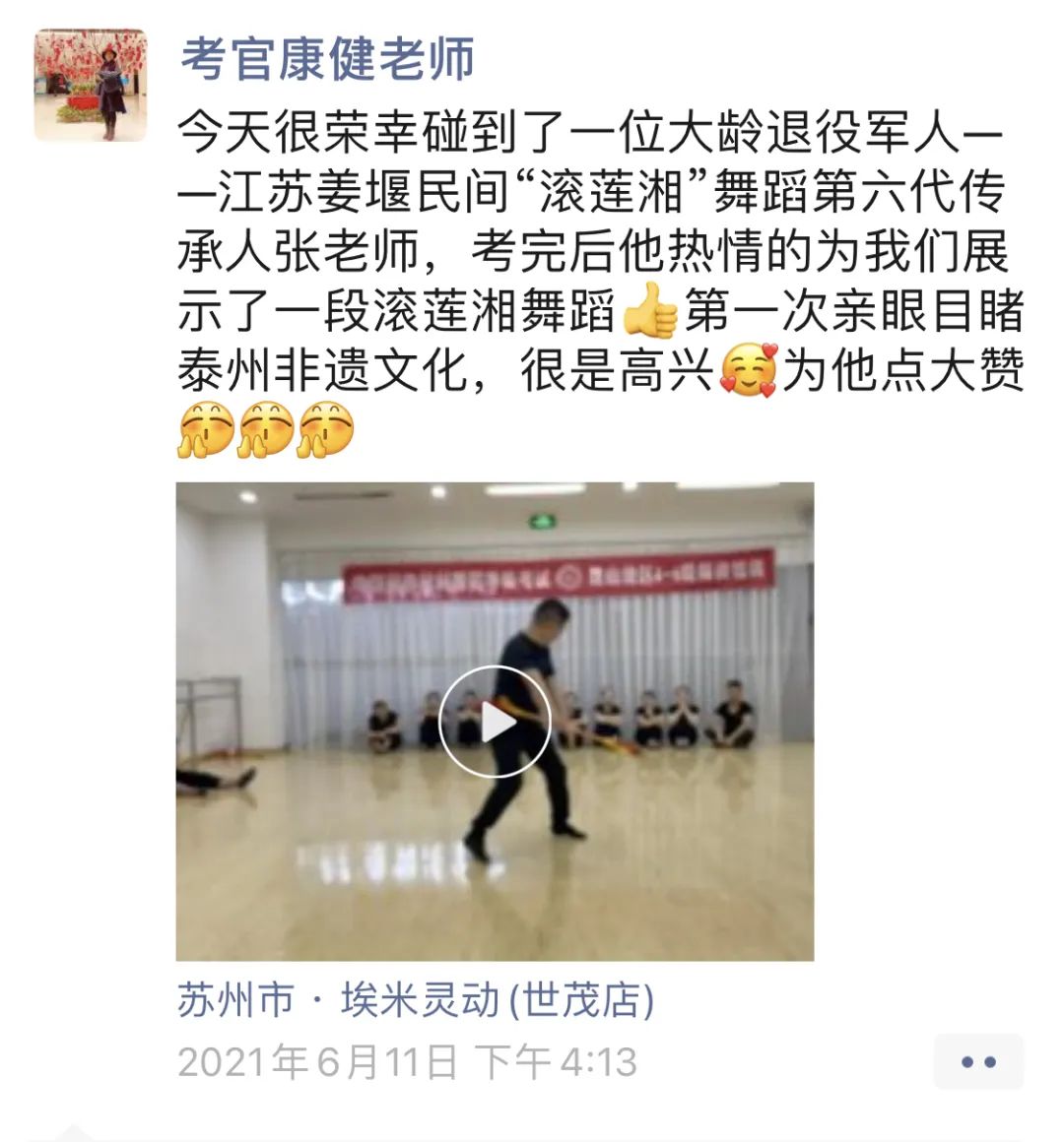 考试结束后,传承人张进军老师为大家展示了非遗舞蹈“姜堰滚莲湘”,他精彩的表演与孜孜不辍的学习精神,得到了考官康健老师的极大肯定与鼓励。