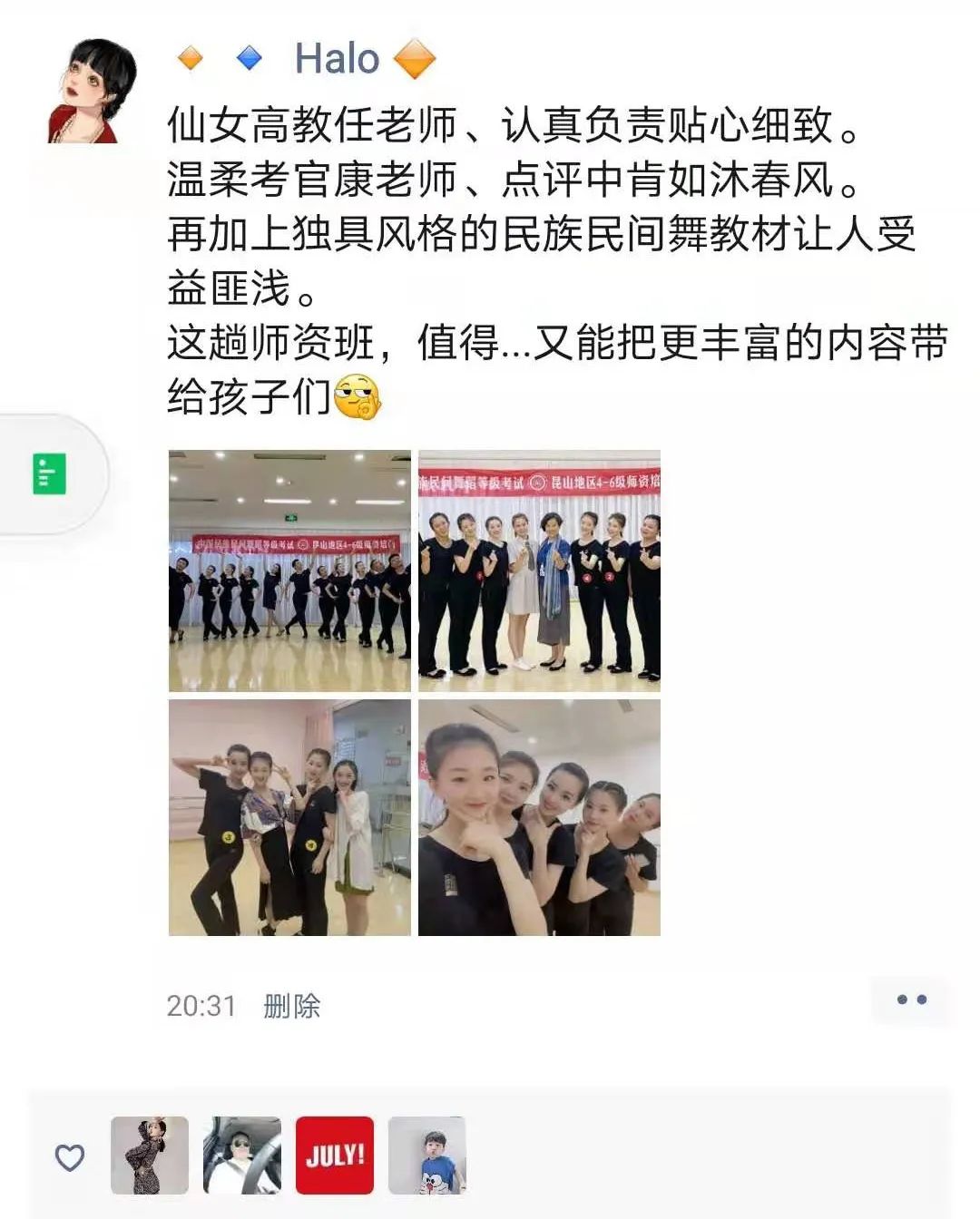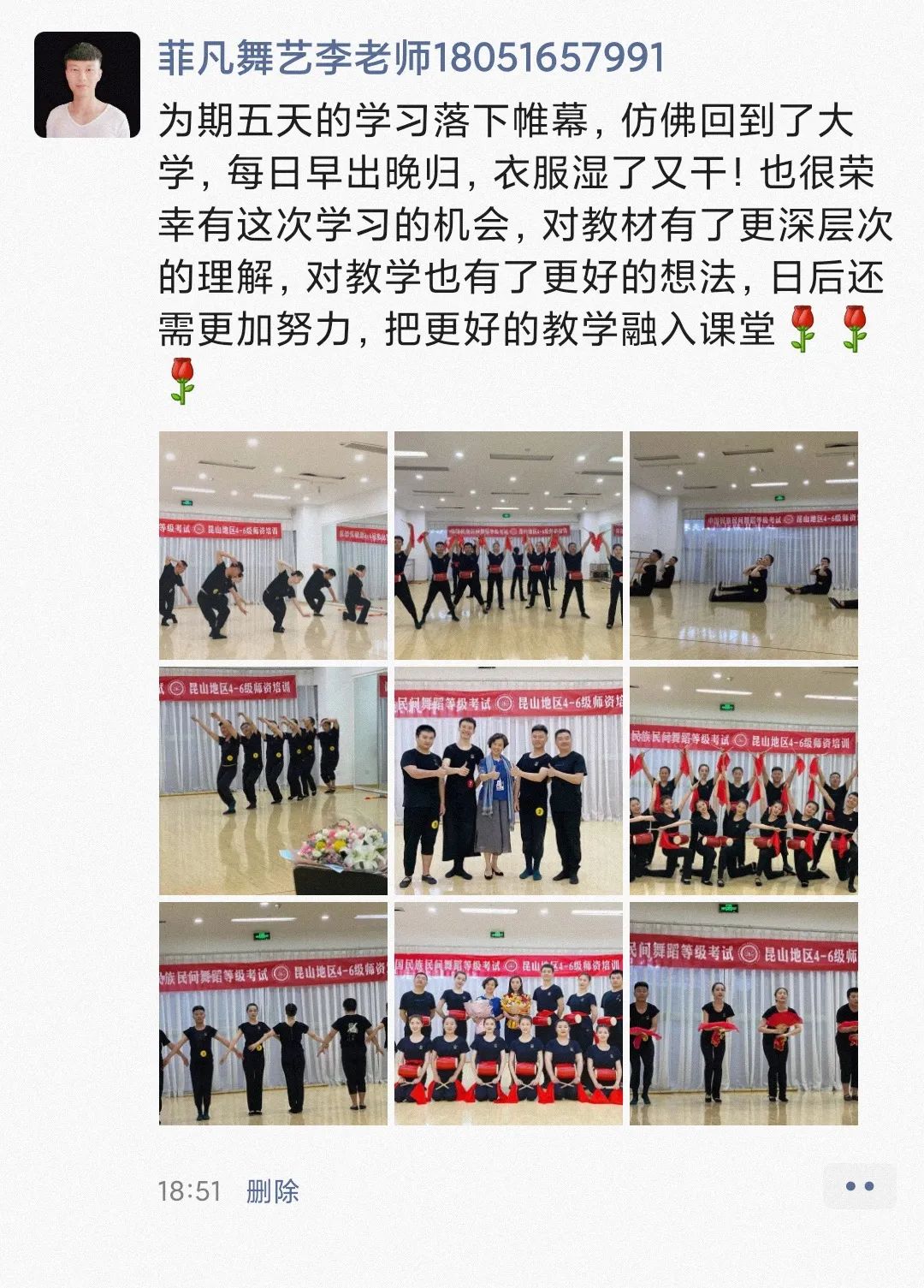 非常高兴《中国民族民间舞蹈等级考试教材》4-6级师资培训能够在昆山地区顺利开班!每当看到学员们刻苦练习时湿透的衣衫,看到他们顺利通过考核时喜悦的泪水,我仿佛也融入其中,与他们一起欢笑与成长。看着学员们所取得的进步,我们感到所有的付出都是非常值得的。