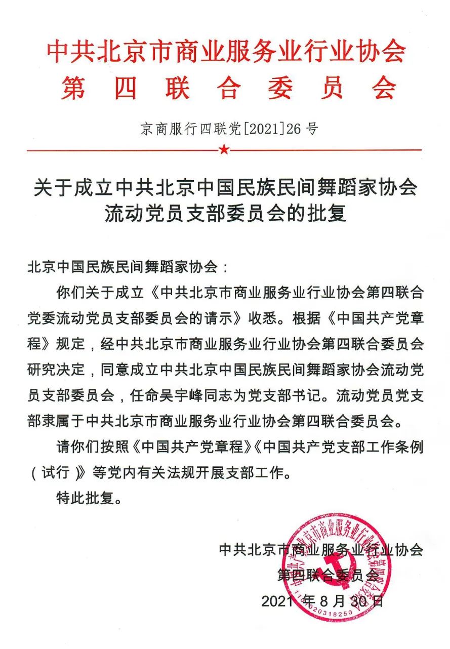 中共北京市商业服务业行业协会第四联合党委 党建指导员 高永懿书记,宣读了《关于成立中共北京中国民族民间舞蹈家协会流动党员支部委员会的批复》。